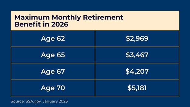 The maximum monthly benefit for a worker retiring at full retirement age (67) is $4,152 in 2026. If you delay Social Security beyond retirement age, you can receive monthly benefits of $5,181 for 2026. You can begin claiming Social Security benefits as early as age 62, but monthly payments will be reduced for each month they’re received before you reach full retirement age.2